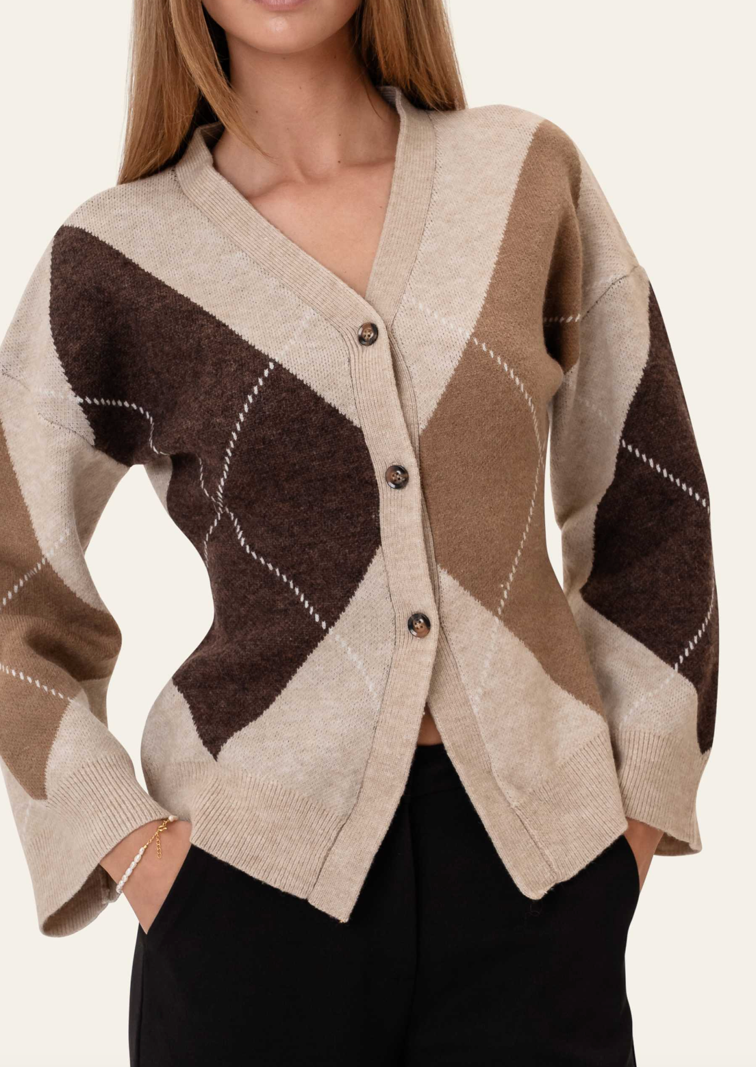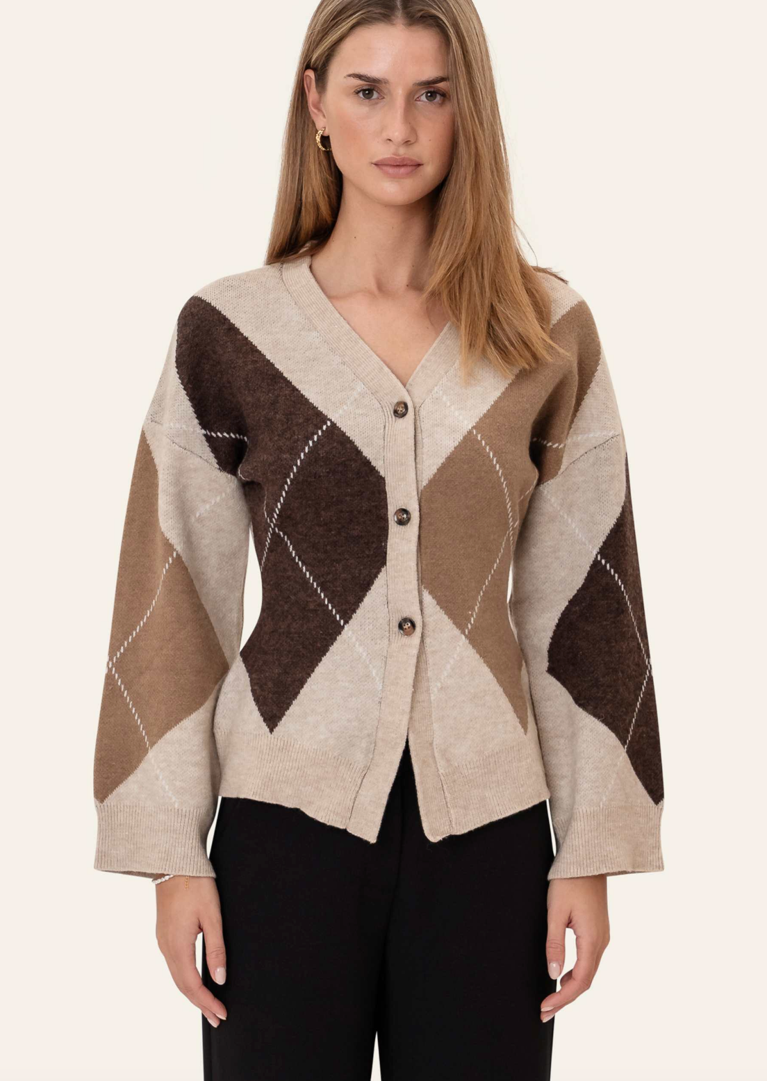 Lekker innsvingt cardigan med trendy ruter, v-hals og lange ermer!